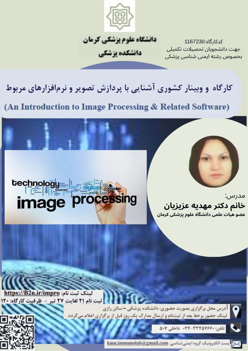 گروه ایمنی شناسی در راستای برنامه آموزشی جدید دانشجویان کارشناسی ارشد و دکترا هفتمین کارگاه از سلسله کارگاه های مذکور را با عنوان " آشنایی با پردازش تصویر و نرم افزارهای مربوطه" در تاریخ 1404/04/29 بصورت حضوری و مجازی برای کلیه دانشجویان تحصیلات تکمیلی علاقمند برگزار می نماید.